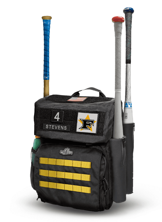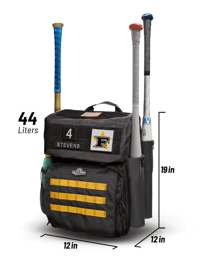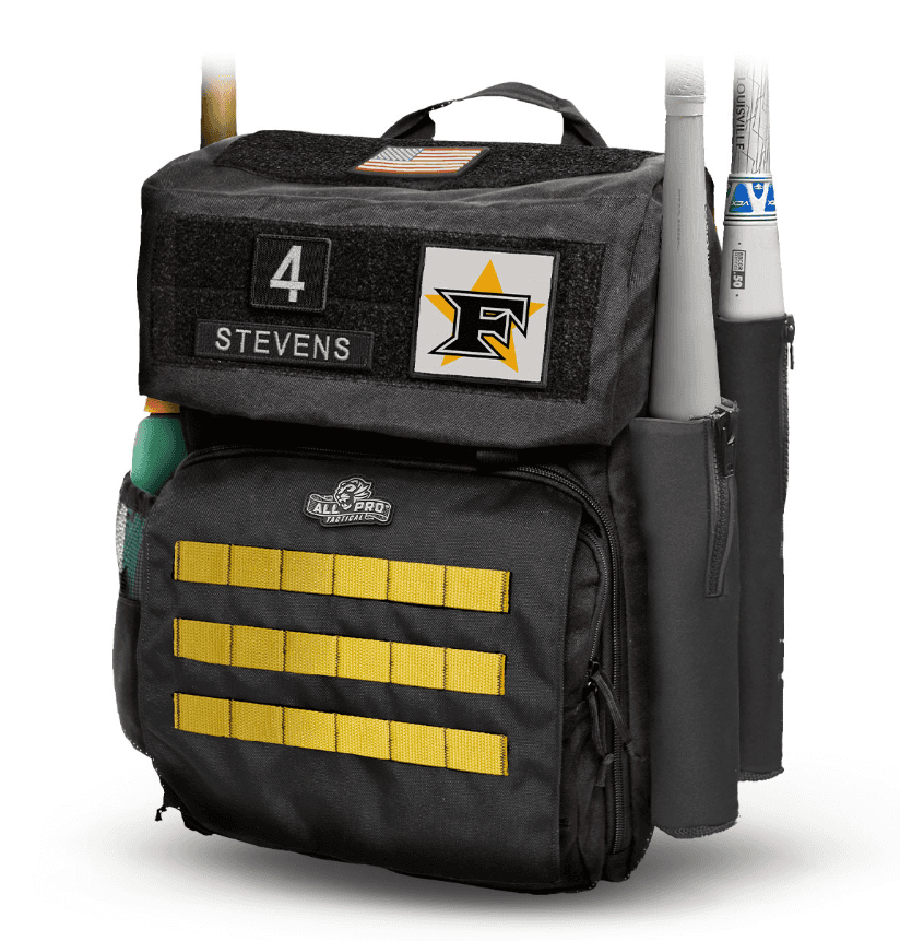 Backed by All-Pro Tactical lifetime guarantee • Fast clip closure top compartment with eared side flaps • 3 Flexible Neoprene sleeves zip tight to keep a firm grip on your bats • Main compartment features an adjustable divider for separating the bottom and top storage areas • Mesh-capped water bottle side storage pocket • Front MOLLE flap with Five Star Gold webbing covers dual cargo pouches • Lift handle for easy hoisting and dual carabineer loops for hanging • Super-padded shoulder straps • Size (L x W x H): 12″ x 12″ x 19″ • Volume (liters): 44L Five Star Edition 3.0 Also Includes: • Name & Number Patch Tape • Five Star Baseball White | Rip-n-Stick™ Pride Patch • American Flag Patch