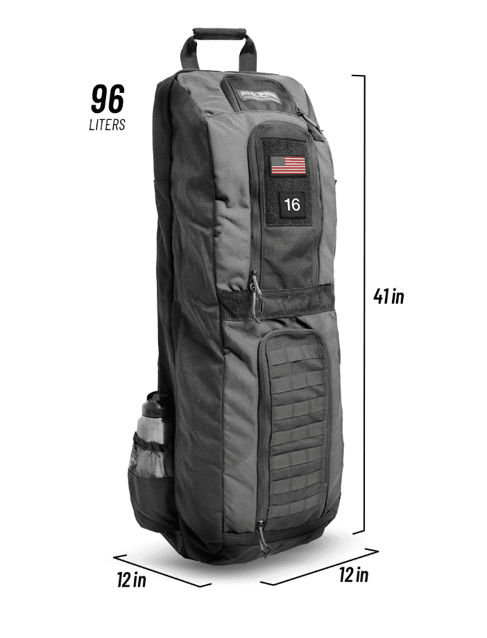 * Full length back panel compartment to secure your sticks. * Removable back compartment insert for added stability and reinforced bottom for extra durability. * Super-padded adjustable shoulder strap and handle for easy carrying. * Felt-lined top pocket provides protection for glasses, goggles, mouth guard and valuables. * Lined waterproof middle pocket perfect for storing wet clothes. * Massive main compartments within pack provides ample room for helmets, pads, cleats, balls and more. * Spacer mesh side vents allow water vapor to escape and control odor. * American flag patch included. Guaranteed for Life. Size (L x W x H): 12″ x 12″ x 41″ Volume (liters): 96L
