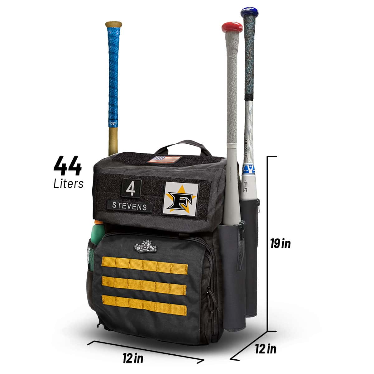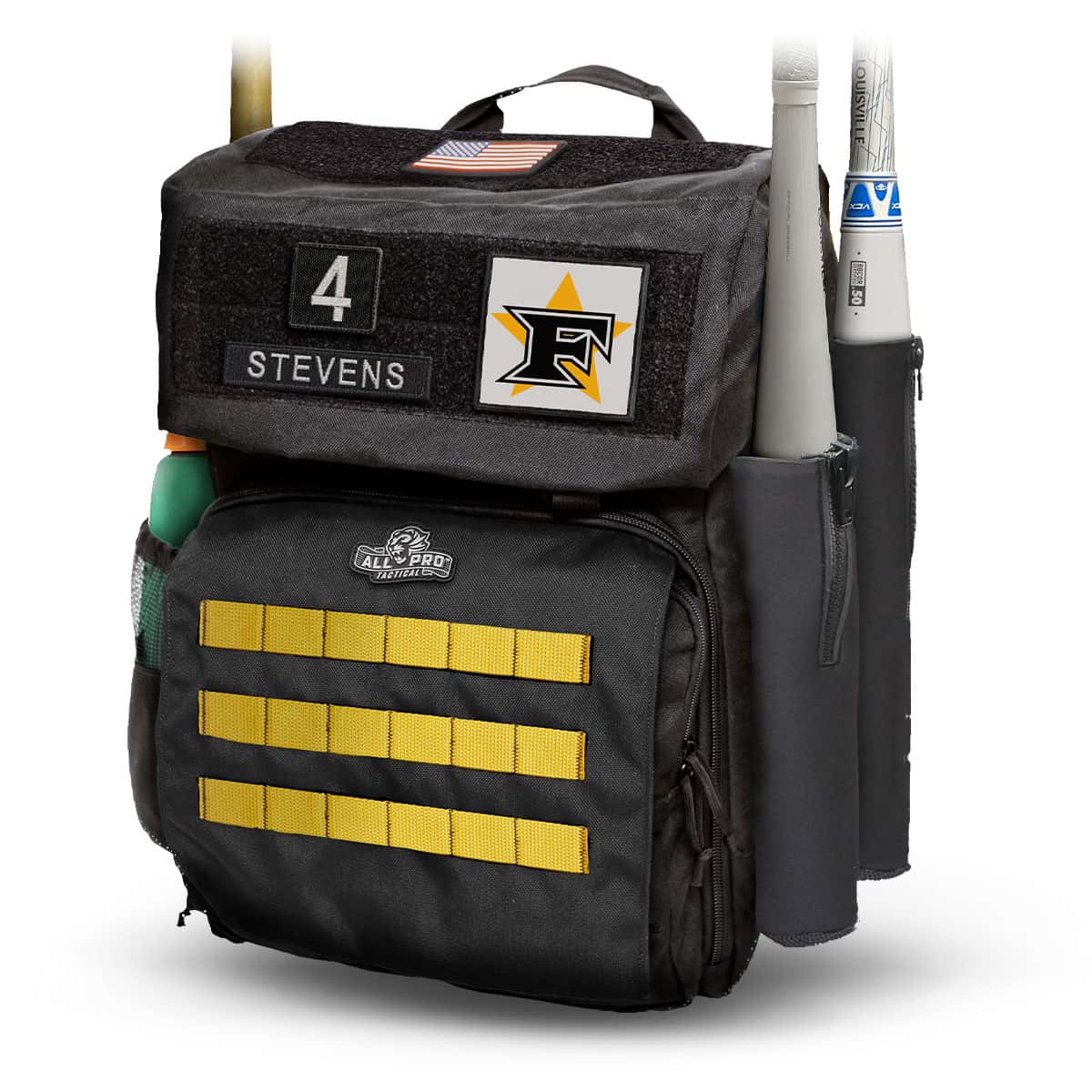 Backed by lifetime guarantee by All-Pro Tactical • Fast clip closure top compartment with eared side flaps • 3 Flexible Neoprene sleeves zip tight to keep a firm grip on your bats • Main compartment features an adjustable divider for separating the bottom and top storage areas • Mesh-capped water bottle side storage pocket • Front MOLLE flap with Five Star Gold webbing covers dual cargo pouches • Lift handle for easy hoisting and dual carabineer loops for hanging • Super-padded shoulder straps • Size (L x W x H): 12″ x 12″ x 19″ • Volume (liters): 44L Five Star Edition 3.0 Also Includes: • Name & Number Patch Tape • Five Star Baseball White | Rip-n-Stick™ Pride Patch • American Flag Patch